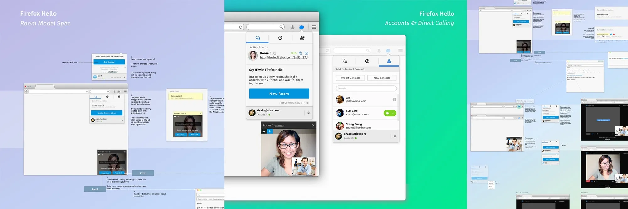 It was bittersweet when I shifted gears again, this time to an early-stage Mozilla initiative which at the time was called Loop. Project Loop (which later became Firefox Hello, and launched in Firefox 35) was Mozilla’s take on web-based communication. Our goals were lofty: account-less (with additional features enabled by a free account), plugin-free, and of course, based on web technologies such as WebRTC. When I joined, Loop was in a good state — in that it worked quite well — but it needed some design thinking to bring it to market in a way that our users would understand and appreciate. While the design process and evolution of Hello is more than enough to write a separate post about, I was thrilled to see it launch in January 2015 to a nice reception, with many writers praising it’s low barrier of entry and cross-platform functionality.