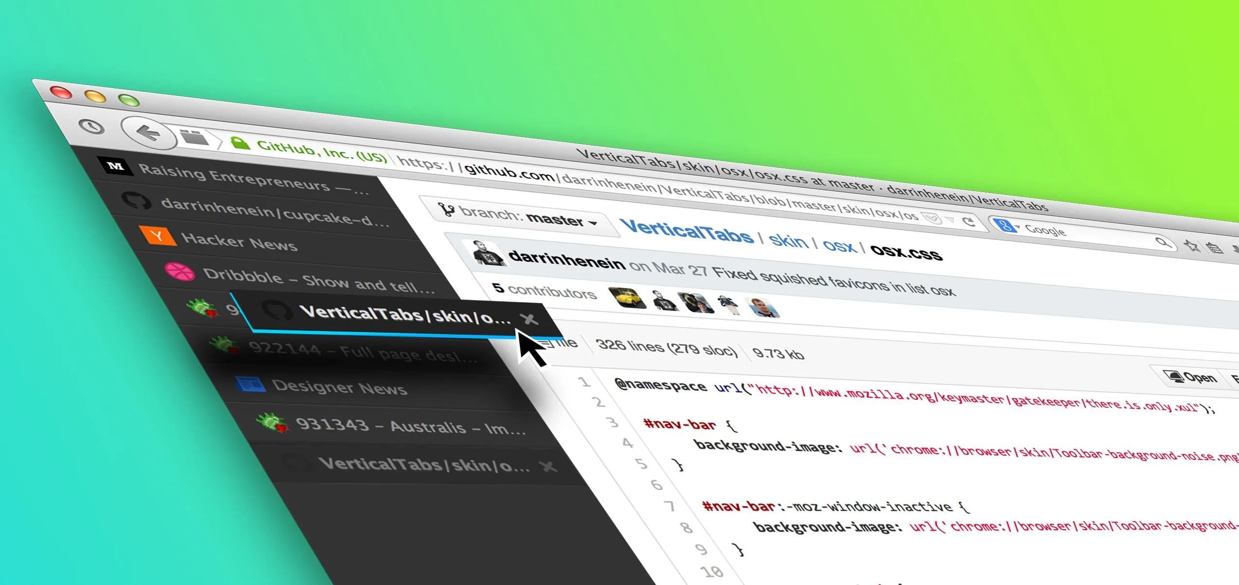 A few months ago, I came across an interesting Github repo authored by my (highly esteemed!) colleague Vlad Vukicevic called VerticalTabs. This is a Firefox add-on which moves your tabs, normally organized horizontally along the top of your browser, to a vertical list docked to either the left or right side of the window. Vlad’s add-on worked great, but I saw a few areas where a small amount of UX and visual design love could make this something I’d be willing to trial. So, I forked.